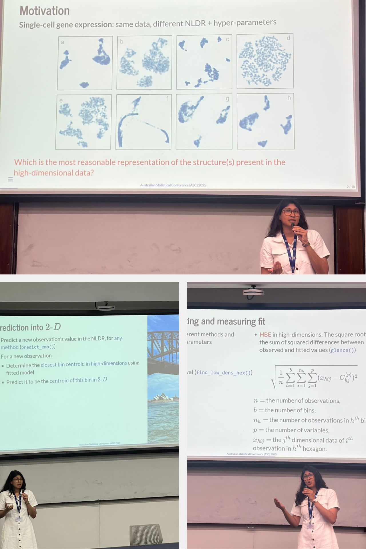 I attended my second ASC Conference, where I had the opportunity to present my research and engage in thoughtful discussions with fellow statisticians. My presentation, “Visualise your fitted non-linear dimension reduction model in the high-dimensional data space”, showcased a methodological and software-based approach for examining how non-linear dimension reduction (NLDR) techniques reshape high-dimensional data. The experience was both intellectually stimulating and professionally rewarding.